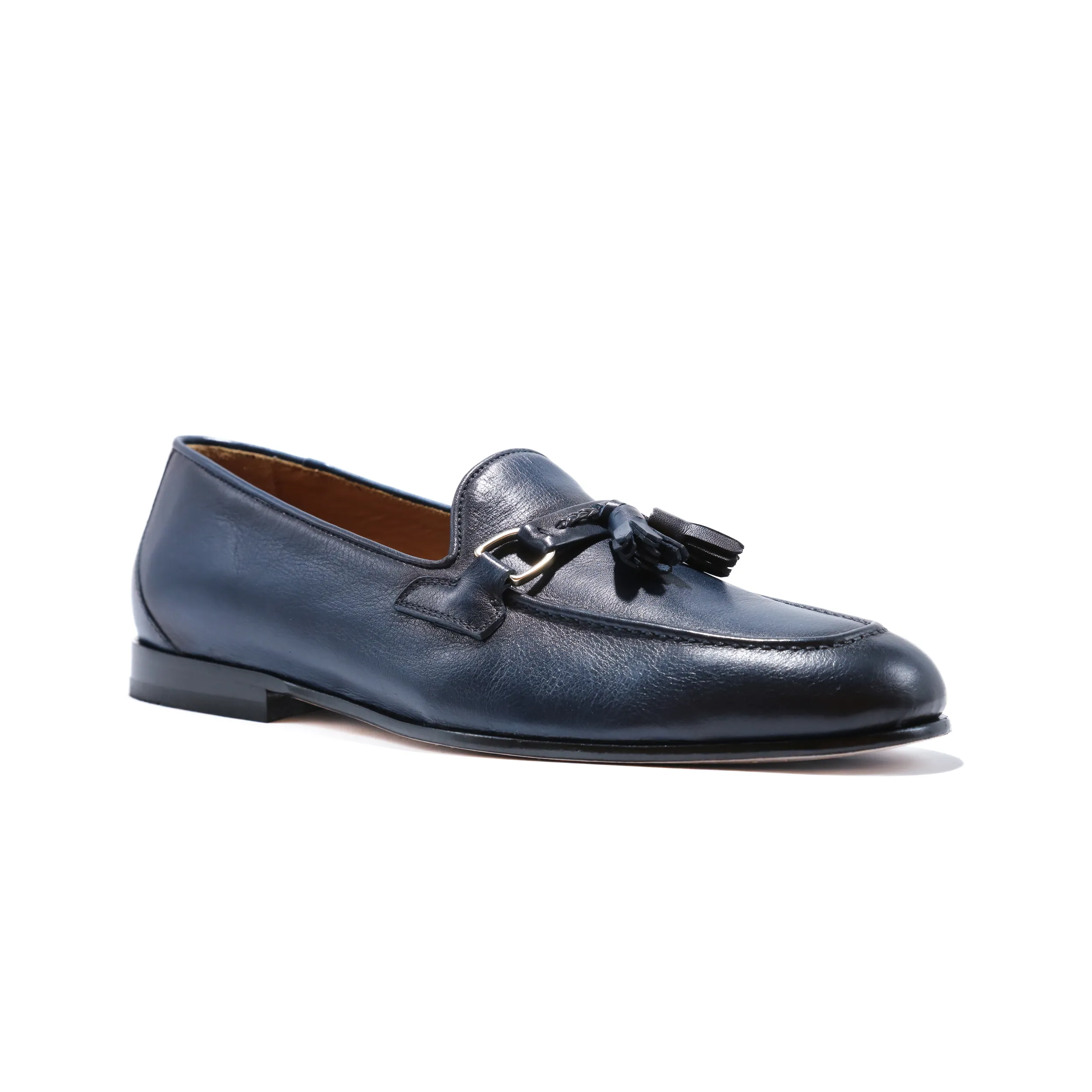 Loafer with tassel and metal buckle in navy blue calf leather